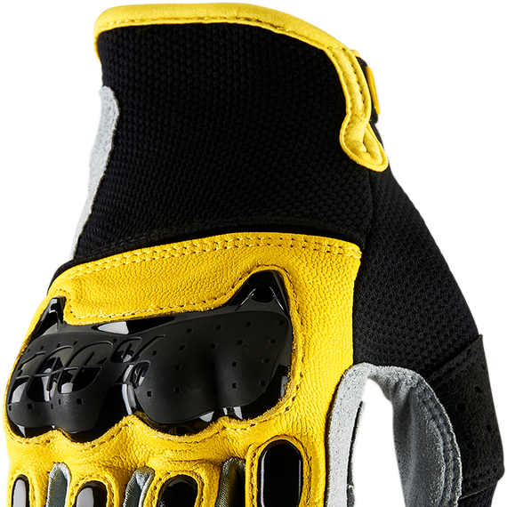 Caracteristicas: Technically advanced glove that is the ideal choice for riders looking for maximum durability with enhanced protection Durable materials and additional armor will allow the rider to attack with confidence Leather top hand with integrated mesh provides comfort and durability Molded knuckle guard adds maximum protection Dual-layer palm with perforated synthetic leather provides comfort and extends wear Padded thumb overlay aids in reducing blisters Mid-finger PVC pads on top of hand add additional protection Goatskin cuff with Thermoplastic Rubber (TPR) wrist closure system ensures proper fit Silicone-printed fingers improve grip and lever traction Integrated tech-thread keeps you connected with phones or MP3 players