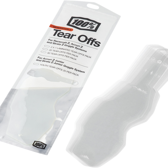 Caracteristicas: Direct replacement tear-offs for 100% Youth Accuri 2 and Youth Strata 2 goggles