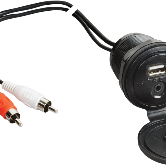 Caracteristicas: USB Interface and/or 1/8" Auxiliary Input Jack Waterproof design USB port allows for connection of external storage device 1/8" audio jack allows input of any MP3 player or external audio device Audio connector (RCA) For use with any stereo with USB capability and/or auxiliary audio inputs ASTM B117 Salt Spray Exposure Standard Compliant ASTM D4329 UV Exposure Standard Compliant Through hole mount with threaded housing and knurled securing nut