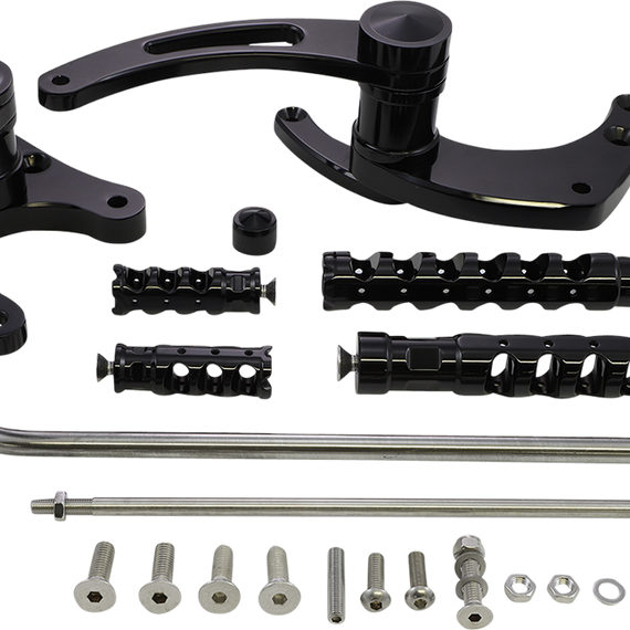 Caracteristicas: CNC-machined from 6061 T-6 aluminum 3/4" mounting plates for superior strength Feature sealed bearings on the pivot points for smooth operation and no maintenance Assembled with chrome hardware, kit comes ready to install Used with existing stock master cylinder Includes foot and toe pegs, mounting hardware and instructions Made in the U.S.A. When installing extended forward controls, check fender clearance before operating.