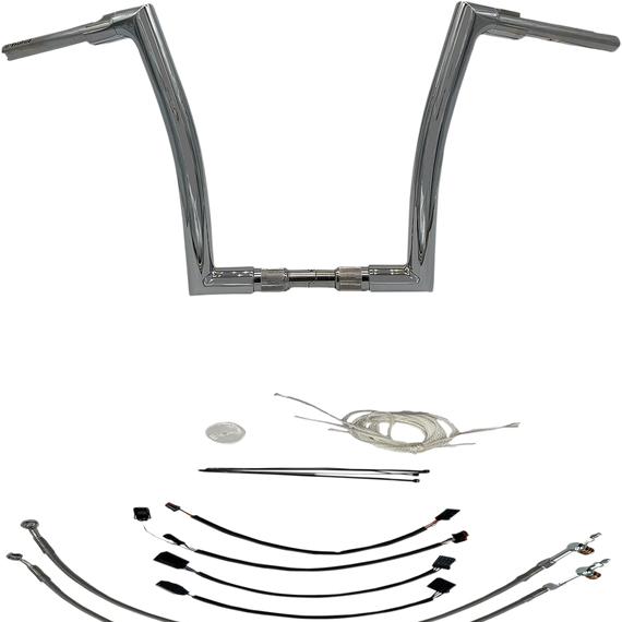 Caracteristicas: Revolutionary bolt-together two-piece handlebar design that takes up half the shelf space, is easy to ship and even faster to install Adjustable 1-½” collar next to handlebar controls for custom look CNC mandrel-bent from 1-1/2" diameter x .095" wall heavy tube EZ install means no more need to fight internal wiring; install handlebar wiring in minutes Install kits include everything needed to install the handlebars in half the time of other kits due to our design that only extends the existing clutch cable/ clutch line and brake lines Handlebars are knurled and notched for TBW applications Made in the U.S.A. Accepts OEM heated grips Patent No. 10,946,926