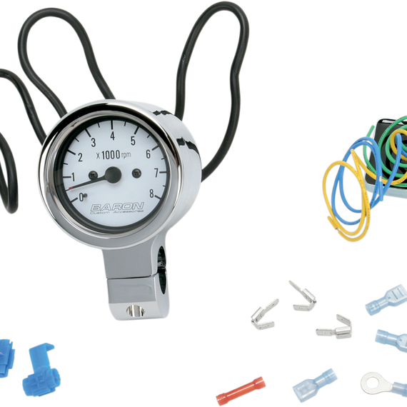 Caracteristicas: Sleek chromed housing measures 3-1/2" L x 2-7/8" D Accurate 0-8000 rpm with a bright illumination for night riding Easily mounts in multiple locations and positions Fits 1" or 1-1/4" handlebars Hardware and instructions are included Include tachometer adapter for single-fire ignitions