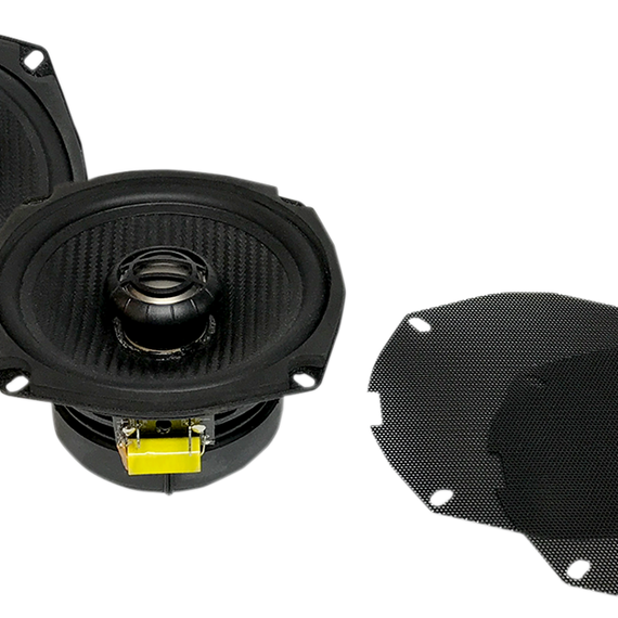 Caracteristicas: Carbon fiber woofer cones Similar to Wild Boar Audio but for ‘98-’13 Bikes Oversized vented magnet controls heat for added reliability Better bass response and sound quality compared to 352F-AA speaker Studio grade crossover components Rated at 150 Watts RMS, 2 Ohm resistance Metal mesh grills included Works best with a 2 ohm stable amplifier