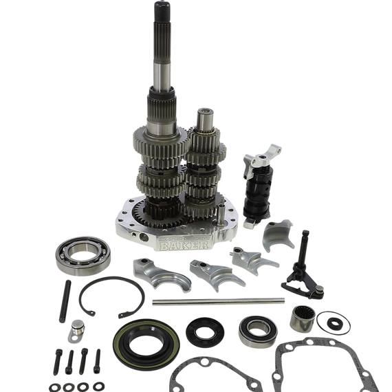 Caracteristicas: Includes polished trap door, all gears, mainshaft, countershaft, shifter drum, detent components, bearings, snap rings, gaskets and hardware Significantly smoother shifting than stock due to a roller detent shift drum with reduced inertia and gear dogteeth with lead-in ramping Gear ratio of 2.93 or 3.24 1st gear and .86 6th gear available Fits into stock and most aftermarket 5-speed transmission cases Made in the U.S.A.