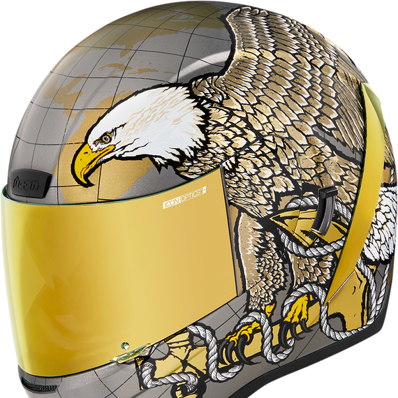 Caracteristicas: Injection molded polycarbonate shell for strength Internal airflow geometry Continuous venting system Sculpted neck roll Fog-free ICON Optics™ Shield with Rapid-Release™ System Prolock™ positive shield locking system Internal Dropshield™ with exterior switch The Dropshield™ visor must only be used while the main face shield is in the fully closed position Removable molded breath deflector Removable Hydradry™ 3-piece moisture wicking liner Internal speaker pockets work with ICON's R.A.U. Bluetooth device Includes Clear and RST Dark Gold ICON Optics™ Shield