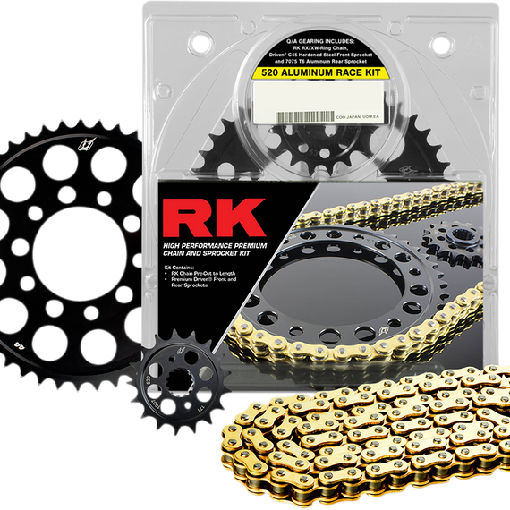 Caracteristicas: 520 Aluminum Race kit features RK’s premium, lightweight RX or XW-ring sealed racing chain with a gold finish Kit includes a premium Driven® 7075 T6511 lightweight Aluminum black hard anodized rear sprocket paired with Driven® C45 steel case hardened and quenched front sprockets Kit includes one-tooth-smaller-than-stock front sprocket RK’s 520 Aluminum Race Kit combines the enhanced performance of race gearing and lightweight rear sprockets to reduce rotating mass Experience quicker starts and quickest to your bike’s red line in every gear without sacrificing normal ride and handling