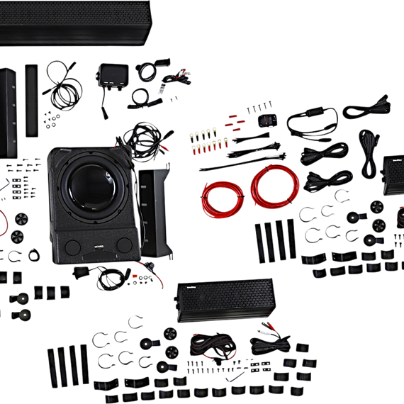 Caracteristicas: Rocker switch bluetooth control 6-1/2” amplified roll-cage speaker system 35” 12-speaker amplified soundbar Two 14” four-speaker amplified soundbars 10” amplified under-seat subwoofer (driver) 10” passive under-seat subwoofer (passenger) Digital-to-digital cable connecting cable Installation kit with 60A circuit breaker