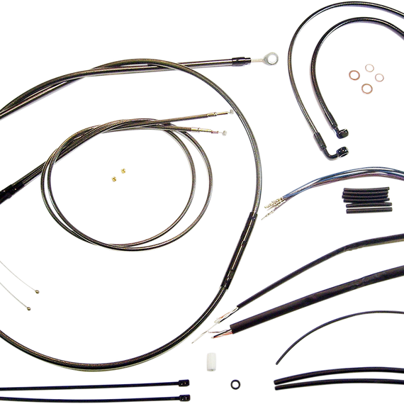 Caracteristicas: The only complete kits with matching braided cables and brake lines Kits include throttle and idle cables of throttle-by-wire extensions, clutch cable or hydraulic clutch line, brake lines, copper crush washers, hardware, and any necessary switch wiring of turn signal extension All cables are a low-effort, high-efficiency design that meets or exceeds all OE specifications for fitment, construction, endurance Kits for dual disc models include an all brazed manifold that eliminates leaks, alignment problems and unattractive threaded connections Assembled in the U.S.A. Kits are based on using ape hanger style handlebars with 2” risers