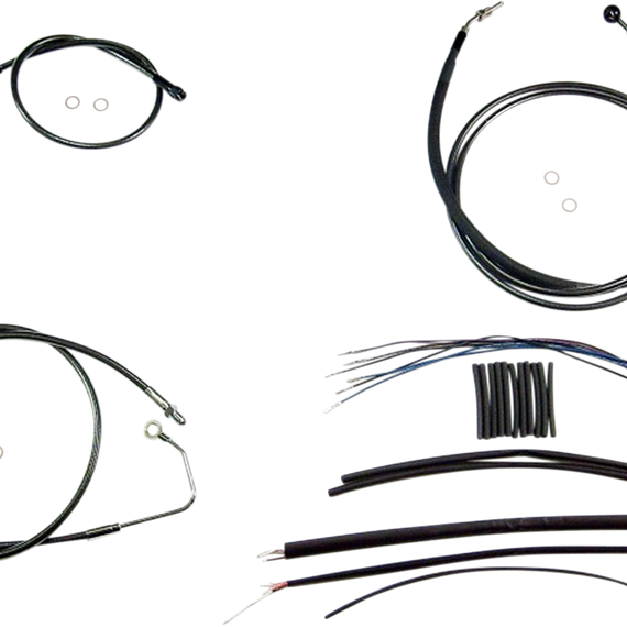 Caracteristicas: Reuses existing lower brake line The only complete kits with matching braided cables and brake lines Kits include throttle and idle cables of throttle-by-wire extensions, clutch cable or hydraulic clutch line, brake lines, copper crush washers, hardware, and any necessary switch wiring of turn signal extension All cable and brake lines feature Black Pearl braid with highly polished black chrome plated fittings All cables are a low-effort, high-efficiency design that meets or exceeds all OE specifications for fitment, construction, endurance Kits for dual disc models include an all brazed manifold that eliminates leaks, alignment problems and unattractive threaded connections Assembled in the U.S.A. Kits are based on using ape hanger style handlebars with 2†risers