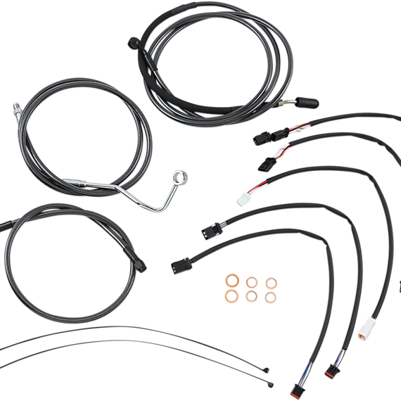 • Kits include throttle and idle cables of throttle-by-wire extensions, clutch cable or hydraulic clutch line, brake lines, copper crush washers, hardware, and any necessary switch wiring of turn signal extension