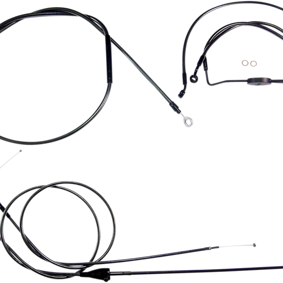 Caracteristicas: The only complete kits with matching braided cables and brake lines Kits include throttle and idle cables of throttle-by-wire extensions, clutch cable or hydraulic clutch line, brake lines, copper crush washers, hardware, and any necessary switch wiring of turn signal extension All cables are a low-effort, high-efficiency design that meets or exceeds all OE specifications for fitment, construction, endurance Kits for dual disc models include an all brazed manifold that eliminates leaks, alignment problems and unattractive threaded connections Assembled in the U.S.A. Kits are based on using ape hanger style handlebars with 2†risers