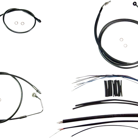 Caracteristicas: Reuses existing lower brake line The only complete kits with matching braided cables and brake lines Kits include throttle and idle cables of throttle-by-wire extensions, clutch cable or hydraulic clutch line, brake lines, copper crush washers, hardware, and any necessary switch wiring of turn signal extension All cable and brake lines feature Black Pearl braid with highly polished black chrome plated fittings All cables are a low-effort, high-efficiency design that meets or exceeds all OE specifications for fitment, construction, endurance Kits for dual disc models include an all brazed manifold that eliminates leaks, alignment problems and unattractive threaded connections Assembled in the U.S.A. Kits are based on using ape hanger style handlebars with 2†risers