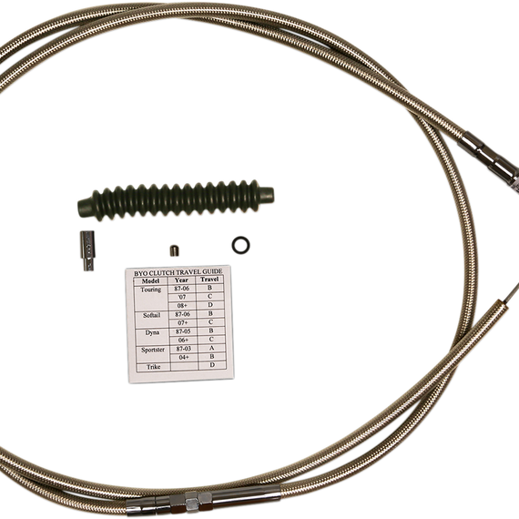 Caracteristicas: BYO cables are extra long to ensure fitment for most plus-length applications Easy installation - route, cut, and assemble in less than 10 minutes Use enclosed template to set free or travel length to factory specifications Throttle and idle kits sold separately Clutch cables are low-effort/high-efficiency design and can make up to 80" of total length Clutch inner cable fitting pull-off strength of 500+ lbs Two-piece clutch cable design fits 1987 and later 5- or 6-speed transmissions models with mechanical clutch