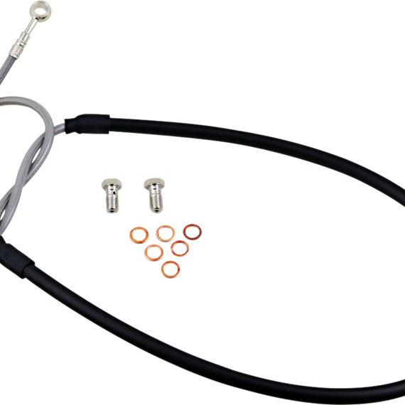 Caracteristicas: 64 braided strands of steel around the line, making the line have zero expansion at any time - better than any other braided line Requires less pressure at the lever, allowing the rider to use less force while stopping the bike faster and with better feel Fittings come from the factory pre-positioned but can swivel 180° if necessary to make the installation process easier Include a clear outer coating which protects the bike from scratches and the lines from humidity Complete with all necessary banjo bolts and washers Ready to install