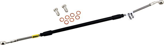 Caracteristicas: 64 braided strands of steel around the line, making the line have zero expansion at any time - better than any other braided line Requires less pressure at the lever, allowing the rider to use less force while stopping the bike faster and with better feel Fittings come from the factory pre-positioned but can swivel 180° if necessary to make the installation process easier Include a clear outer coating which protects the bike from scratches and the lines from humidity Complete with all necessary banjo bolts and washers Ready to install