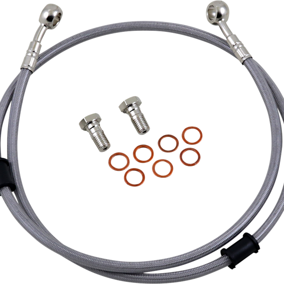 Caracteristicas: 64 braided strands of steel around the line, making the line have zero expansion at any time - better than any other braided line Requires less pressure at the lever, allowing the rider to use less force while stopping the bike faster and with better feel Fittings come from the factory pre-positioned but can swivel 180° if necessary to make the installation process easier Include a clear outer coating which protects the bike from scratches and the lines from humidity Complete with all necessary banjo bolts and washers Ready to install