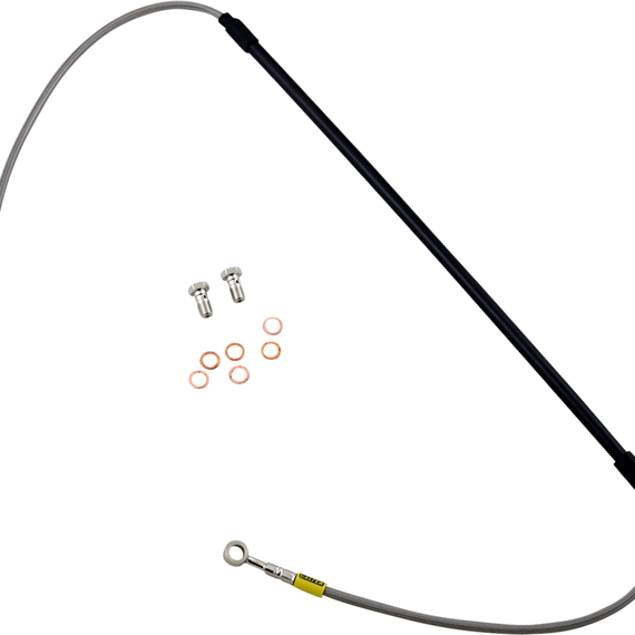 Caracteristicas: 64 braided strands of steel around the line, making the line have zero expansion at any time - better than any other braided line Requires less pressure at the lever, allowing the rider to use less force while stopping the bike faster and with better feel Fittings come from the factory pre-positioned but can swivel 180° if necessary to make the installation process easier Include a clear outer coating which protects the bike from scratches and the lines from humidity Complete with all necessary banjo bolts and washers Ready to install