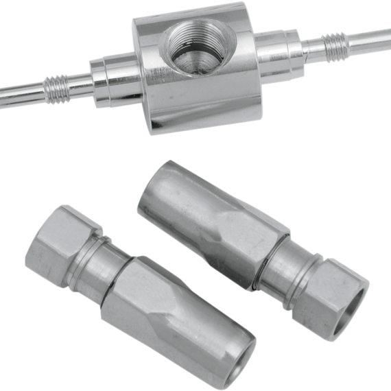 Caracteristicas: Organized in a labeled, compartmental carrying case and include 25' of non-yellowing clear or black coated braided stainless steel hose, chrome or black chrome plated banjos, polished stainless hardware, copper crush washers plus a set of durable Aluminum BYO™ Vise Jaws Master Builder Kits include everything in the Deluxe Kits, plus additional banjos along with four brazed and plated manifolds to build most dual front disc brake lines Deluxe Builder Kits contain banjos and fittings to build multiple front single disc brake lines, hydraulic clutch lines and most rear brake lines Patented design meets all FMV55-106 standards once assembled per the included instructions for safe and reliable on-road use Basic Builder Single Disc Kits contain 7/16" and 10mm banjos and fittings to build multiple front single disc brake lines Designed for Magnum brake lines Brake hose and fittings are compliance labeled, pressure tested and 100% inspected NOT for use with Anti-lock Brake Systems Black and Basic BYO™ single disc builder kits do NOT contain rear brake line T-blocks or inverted flare fittings. Black and Basic BYO™ Single Disc Builder Kits Hydraulic Clutch Fittings are a natural stainless steel finish.