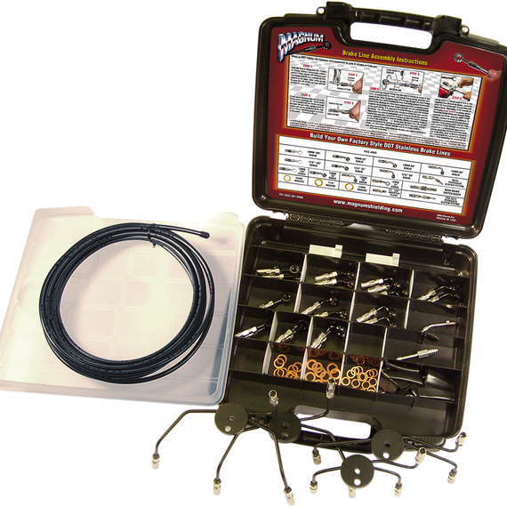 Caracteristicas: All kits are organized in a labeled, compartmental carrying case and include 25’ of non-yellowing clear braided stainless steel hose, chrome plated banjos, polished stainless hardware, copper crush washers plus a set of durable Aluminum BYO® Vise Jaws Assemble lines in only 5 minutes with a pair of side cutters and a 7/16” wrench for a perfect fit and alignment every time Master Builder Kits include everything in the Deluxe Kits, plus additional banjos along with 4 brazed and plated manifolds to build most dual front disc brake lines Brake hose and fittings are compliance labeled, pressure tested and 100% inspected Patented design meets all FMV55-106 standards once assembled per the included instructions for safe and reliable on-road use.* NOT for use with Anti-lock Brake Systems