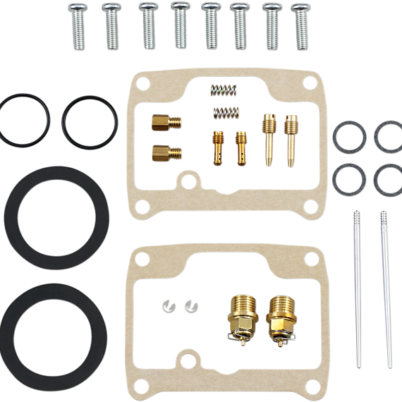 Caracteristicas: Kit includes all necessary O-rings, gaskets, jets, needle, mixture screw, float bowl screws, float valve needle and seat (needle jet and other pressed-in jets are not included in kit) NBR rubber material is used on all O-rings and rubber gaskets; NBR has excellent resistance to the ethanol used in today's fuels Applications that use paper float bowl gaskets are upgraded to High Performance Interference Gasket material Models with multiple carburetors include components to repair all carburetors OEM jet sizes and slide needles are included in the kit