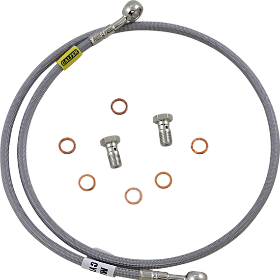 Caracteristicas: Stainless Steel lines are typically the first upgrade you should make Stock rubber lines will break down and expand, causing a spongy feel or worse. Steel lines eliminate expansion which results in consistent feel and performance Made with only DuPont virgin grade PTFE (Polytetrafluoroethylene) inner core 64 strand braid Includes all mounting components, extra washers, and line end labeling, and bike specific installations R&D and manufacturing done in the US