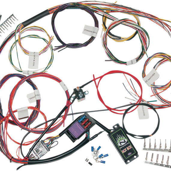 • Complete bike harness w/ starter relay, 3-circuits, self-canceling and run, brake and turn signal module