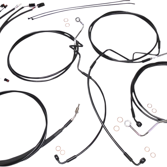 Caracteristicas: Magnum XR Handlebar Installation Kits offer a great fit and excellent quality at an economical price Kit features highly polished, chrome plated fittings All cables are a low effort, high efficiency design that meets or exceeds all OE specifications for fitment, construction, endurance Magnum XR Brake Lines use an enhanced construction of heavy gauge stainless steel embedded in tough abrasion resistant nylon outer jacket for superior durability and extreme braking response for safe riding The coating on cables and brake lines offers exceptional protection for paint or chrome Kits that include manifolds use an all brazed construction to ensure optimal OE fitment and appearance Manifolds use -3 AN connections for an easy installation Kits include throttle and idle cables or throttle-by-wire extensions, clutch cable or XR hydraulic clutch line, XR brake lines, copper crush washers, hardware, turn signal and switch wiring extensions Kits are based on using ape hanger style handlebars and 2" risers.