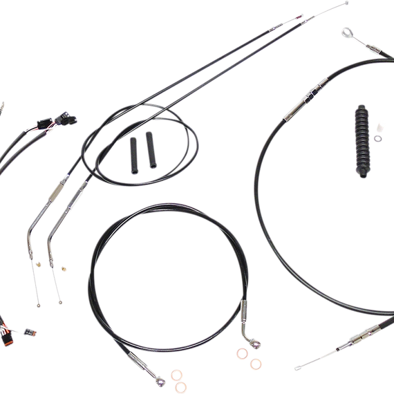 Caracteristicas: Magnum XR Handlebar Installation Kits offer a great fit and excellent quality at an economical price Kit features highly polished, chrome plated fittings All cables are a low effort, high efficiency design that meets or exceeds all OE specifications for fitment, construction, endurance Magnum XR Brake Lines use an enhanced construction of heavy gauge stainless steel embedded in tough abrasion resistant nylon outer jacket for superior durability and extreme braking response for safe riding The coating on cables and brake lines offers exceptional protection for paint or chrome Kits that include manifolds use an all brazed construction to ensure optimal OE fitment and appearance Manifolds use -3 AN connections for an easy installation Kits include throttle and idle cables or throttle-by-wire extensions, clutch cable or XR hydraulic clutch line, XR brake lines, copper crush washers, hardware, turn signal and switch wiring extensions Kits are based on using ape hanger style handlebars and 2" risers.