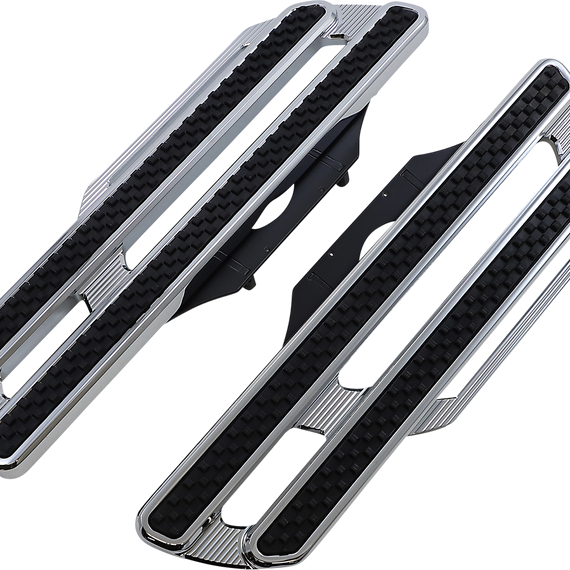 Caracteristicas: Lightweight and see-through designs with machined accent cuts on top and sides of board Machined from forged billet aluminum Driver board features three mounting locations and for up to 3" of adjustability Longer than stock for extra foot room and added comfort Includes all mounting hardware Models w/ passenger footpegs will require the use of OEM accessory floorboard mounts.