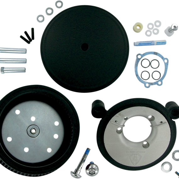 Caracteristicas: Features a one-piece aluminum backing plate/carb support bracket with patented hidden breather technology and radius air inlet Breather passages exit at the mouth of the carburetor/throttle body, creating a virtually closed-loop system Kit includes a 20% larger high-performance filter and steel outer cover Eliminates the need for banjo fittings, hoses and filter All necessary hardware and instructions are included Includes Standard pre-oiled filters Made in the U.S.A.