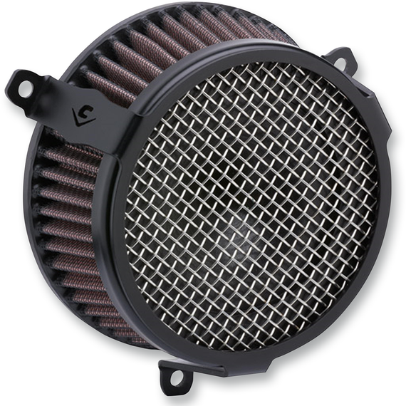 Caracteristicas: The Cobra system consists of a laser-cut, formed steel cover, separate mounting ring, and all the fasteners, seals, backing plate and mounting hardware for easy installation Flows better than stock or competing units, in large part because of its unique internal venturi design of the inner filter High-flow K&N® Air Filter element ensures the maximum air intake and protection Slim profile keeps the unit away from the rider’s leg Formed stainless steel mesh insert Optimizes overall performance Made in the U.S.A.