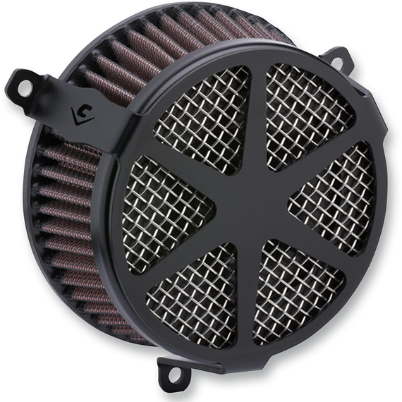 Caracteristicas: The Cobra system consists of a laser-cut, formed steel cover, separate mounting ring, and all the fasteners, seals, backing plate and mounting hardware for easy installation Flows better than stock or competing units, in large part because of its unique internal venturi design of the inner filter High-flow K&N® Air Filter element ensures the maximum air intake and protection Slim profile keeps the unit away from the rider’s leg Formed stainless steel mesh insert Optimizes overall performance Made in the U.S.A.