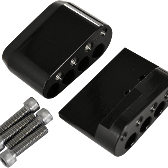 Caracteristicas: Provides two additional floorboard positions with blocks and three positions for the floorboards, five positions total both up and down Approximately 1-1/4" to 2" higher than the highest stock setting The tilted position places the floorboards at an ergonomic plane relieving stress in the legs and calves This tilted position also allows the passenger to push into the boards when cornering, which provides a more secure feeling Provides two additional spacing widths to add additional comfort by placing the floorboards wider apart The wider position allows passengers to relax their lower body, which takes pressure off of the inner thighs, knees and lower back Made in the U.S.A.