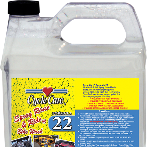 Caracteristicas: Cycle Care® Formula 22 is just as safe as water Will not strip polish, etch or stain aluminum Will not harm clear coat/paint, black powder-coat engine, leather accessories Frequent cleaners may use the product effectively at 50/50 solution Made in the U.S.A.