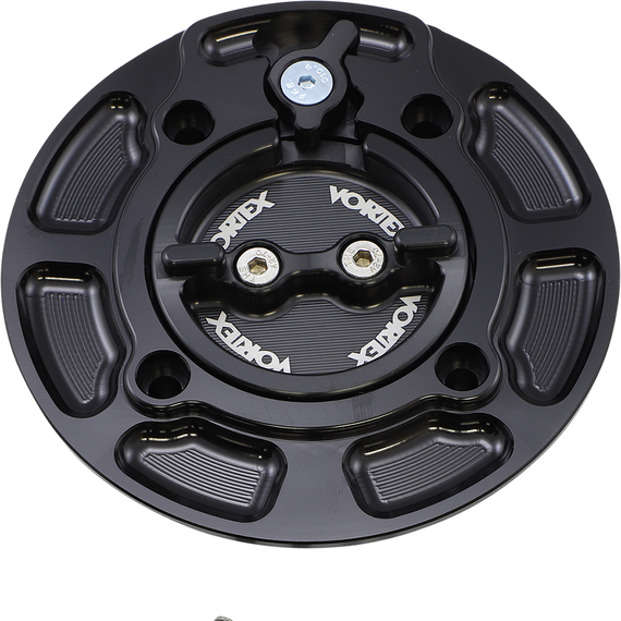 Caracteristicas: Coarse thread enables quick closure without cross-threading Large contoured finger tabs allow for easier opening compared to classic Vortex design Safety lock switch prevents accidental cap loosening due to vibration or contact Integrated dual check valve assembly eliminates fuel tank pressure issues Vent and chamber design helps stop leaks by containing any fuel that gets past the check valve Up to 55% lighter than stock keyed fuel tank caps Comes standard with silver lock switch Made in the U.S.A.
