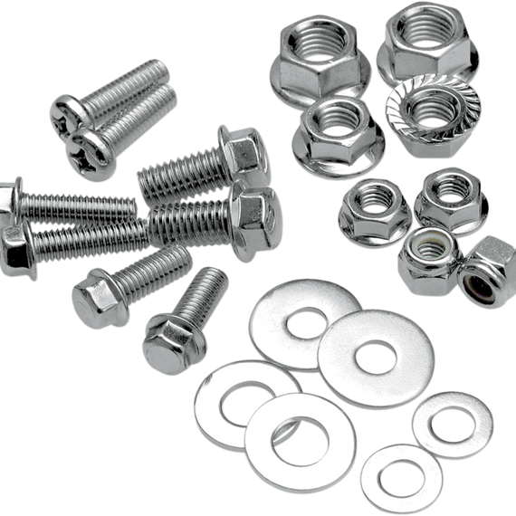 Caracteristicas: Convenient store display board with 12 individual Mini Hardware Kit bags including; 6 mm, 10 mm, 8 mm, 8x16 flange nuts, 6 mm fender washer, 8 mm flat washer, 6x16 flange bolt, 6 mm lock nut, 6x20 flange bolt, 6x20 pan screw and 6 mm flat washer Each Mini Hardware Kit bag contains 22 of the most commonly needed nuts, bolts and washers for off-road/MX repairs Designed for modern off-road, MX and dual-sport motorcycles Perfect size to carry in your tool pack for trail-side repairs Sold in a card of 12 packs