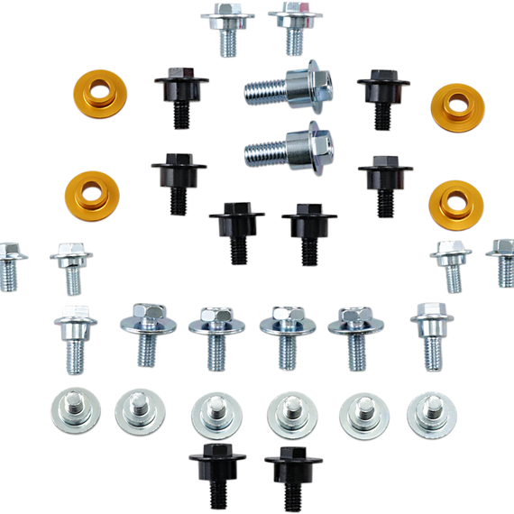 Caracteristicas: Designed to help you maintain and restore your bike 10.9 OEM grade & original factory configuration for precise fit Includes bolts for front fender, rear fender, fork guards, side panels, front number plate, seat and radiator shrouds (and air box on applicable models) Race Ready Carry Capsule included for convenience & organization Fitment spans multiple years and models, thus bonus hardware may result based on which year/model fastener kit is applied to