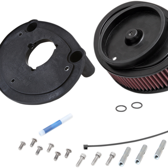 Caracteristicas: Oversized black powder-coated aluminum backing plate provides solid mounting Fits behind the OE air cleaner cover maintaining the factory appearance Replaces the stock air filter and cleaner backing plate assembly Washable, oversized K&N high flow air filter equals longer life Dyno tuned velocity stack directs airflow to engine Built in breathers replace external OE breathers Guaranteed increase in horsepower Does not include cover Made in the U.S.A.