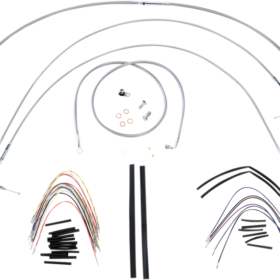 Caracteristicas: Complete installation kit for Burly Ape hangers Kits include extended brake line, extended clutch cable/clutch line, extended throttle/idle cables as required and all necessary wiring Brake lines feature PTFE inner liner and heavy-duty stainless steel outer braid Dresser kits reuse stock Throttle-By-Wire harness Kits are based on using 2" risers with ape hanger-style handlebars