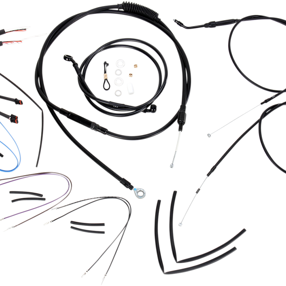 Caracteristicas: Complete installation kit for Burly Ape hangers Kits include extended brake line (unless noted), extended clutch cable/clutch line, extended throttle/idle cables as required and all necessary wiring Brake lines, when included, feature PTFE inner liner and heavy-duty stainless steel outer braid Dresser kits reuse stock Throttle-By-Wire harness Kits are based on using 2" risers with ape hanger-style handlebars