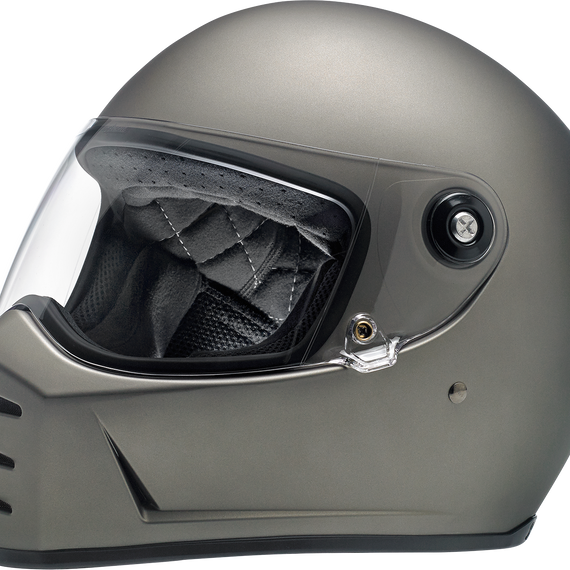 Caracteristicas: Biltwell proprietary ABS outer shell with hand-painted finish Shock-absorbing expanded polystyrene inner shell Hand-sewn removable brushed Lycra liner w/ contrasting diamond-stitched quilted open-cell foam padding Hand-stitched interior padding, cheek pads and Bio-Foam chin bar cushion for comfort Generous vents in the chin bar get the air flowing and the outlet in back lets hot air escape Shield boasts extremely accurate optics and simple hinge mechanics for high style and easy removal for replacement or cleaning Mesh pockets are included in the ear recess--perfect for aftermarket drop-in communication systems (not included) Injection-molded face shield with the same aluminum hinge covers and mounting hardware