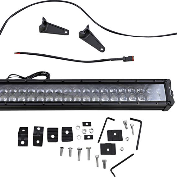 Caracteristicas: Input voltage: 10-30v dc Color temperature: 6000k Beam pattern: combo: spot (8) Current Consumption at 13.8V: 9.5 A IP Rating: IP67 Brackets ,mounting pads, stainless steel screens, allen keys and pigtail harness included for installation