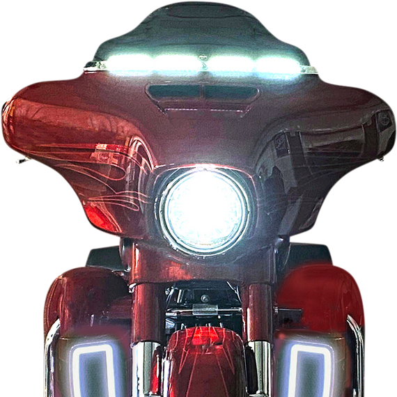 Caracteristicas: Direct replacement for the lower fairing radiator grills or filler plates With more than 130 white and amber LEDs per side, the inserts produce a bright white running light with amber turn signal that's virtually invisible when off. Unit simply snaps in place with plug and play wiring for easy installation. When the turn signal is activated the white DRL running light turns completely off providing greater visibility to the amber turn signal