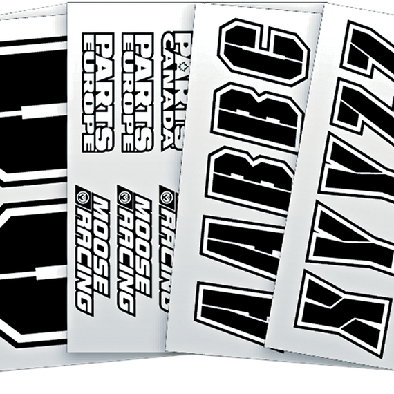 • Kit includes: (6 ea.) Moose Racing and (2 ea.) Parts Unlimited, (2 ea.) Parts Canada and (2 ea.) Parts Europe logos, (3 ea.) 0-9, (4 ea.) A-Z