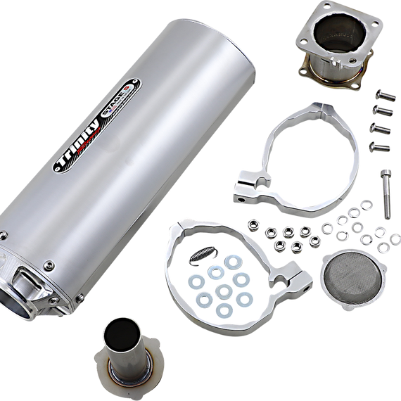 Caracteristicas: 304 brushed stainless steel collector Single 14" aluminum muffler 2.5-inch baffle for improved exhaust flow Fully Tig Welded 6061 Billet Muffler Clamps 6061 Billet Machined Exhaust Tip Oxygen sensor bung Quiet core included Spark arrestors Significant horsepower and torque gains Includes laser-cut Trinity back plate Made in the USA