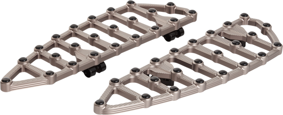 Caracteristicas: MX floorboards feature a detailed cut through design with integrated rubber inserts for excellent foot traction CNC machined from a solid block of billet aluminum Rubber inserts offer foot traction and protect the finish of the aluminum floorboard, replaceable Extended length for added foot room and comfort