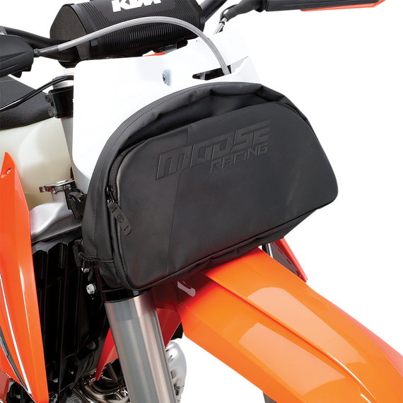 Caracteristicas: Easily mounts to your headlamp cowl or front number plate Access your stuff without dismounting from your ride Multiple internal and external storage compartments are perfect for tools and items needed for laying out events or doing course worker maintenance Elastic backing sleeve and quick release buckle straps make mounting and removal a snap Upper and lower strap locations permit securing the pack to fork tubes, handlebars or both New rugged 500D tarpaulin material construction protects your cargo and easily handles the rigors of offroad use, and is easy to clean YKK zippers