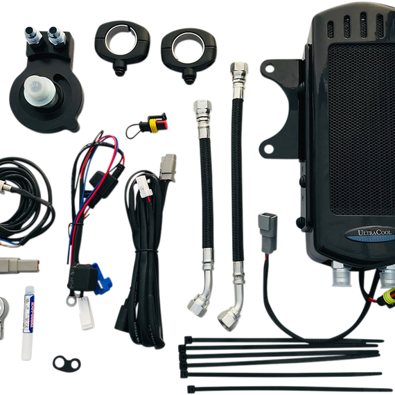 Caracteristicas: Oil Adapter and Thermal Switch with waterproof connectors automatically turns on the powerful dual fans when oil reaches 210 degrees Specially designed aluminum heat exchanger with turbulators for maximum heat dissipation Sealed Waterproof IP68 Dual Fans producing 220 CFM of airflow Plug and play wiring harness with relay and waterproof connectors that all connects to the battery under the seat for simple installation Black nylon coated stainless steel braided oil lines with AN6 fittings L.E.D. indicator light indicates when the fans are operating Special designed Oil Line Fitting Wrench and detailed instructions included