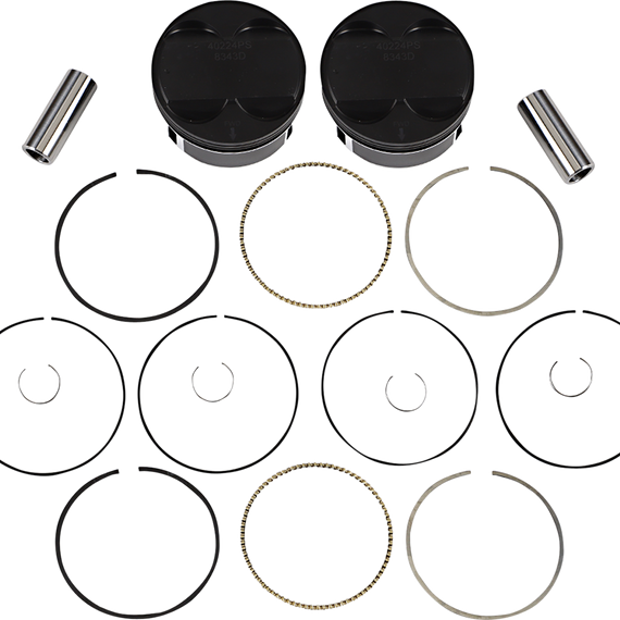 Caracteristicas: Feature ArmorX™ piston coating for superior protection in extreme conditions and reduced wear ArmorFit™ skirt coating auto-adjusts to the cylinder wall so there’s no need to measure clearance; provides smooth, quiet, trouble-free operation Dome design for improved flame travel to maximize air/ fuel burn efficiency High compression (11:1) for added power Superfinish piston pin reduces friction and improves scuff resistance Enhanced pin oiling for improved lubrication and reduced friction Augmented ring land details improve ring seal and function Dedicated rings for precise fit, improved compression and oil control Fit OEM and Screamin’ Eagle cylinder heads Kit includes two pistons, rings, piston pins and circlips Made in the U.S.A