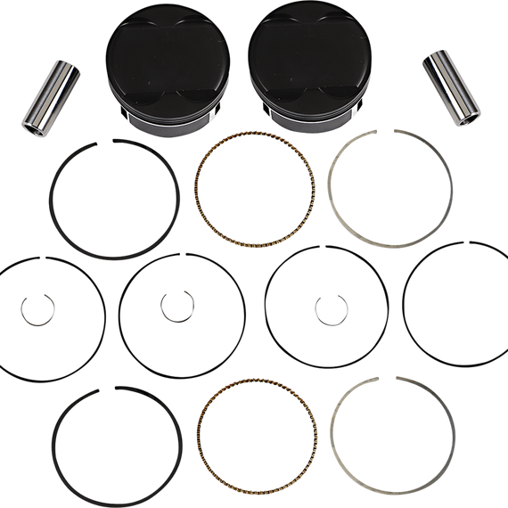 Caracteristicas: Feature ArmorX™ piston coating for superior protection in extreme conditions and reduced wear ArmorFit™ skirt coating auto-adjusts to the cylinder wall so there’s no need to measure clearance; provides smooth, quiet, trouble-free operation Dome design for improved flame travel to maximize air/ fuel burn efficiency High compression (11:1) for added power Superfinish piston pin reduces friction and improves scuff resistance Enhanced pin oiling for improved lubrication and reduced friction Augmented ring land details improve ring seal and function Dedicated rings for precise fit, improved compression and oil control Fit OEM and Screamin’ Eagle cylinder heads Kit includes two pistons, rings, piston pins and circlips Made in the U.S.A
